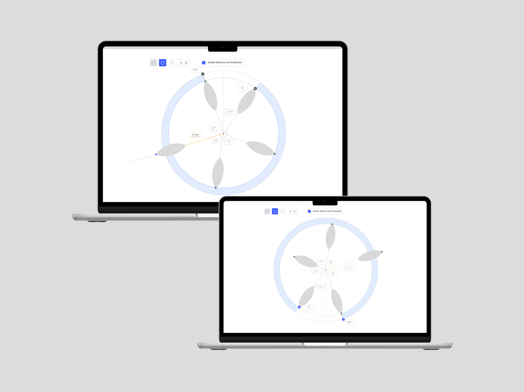 The start and end angles can be changed using a handle or an input field. This also reduces the interior angles. The start angle is always fixed. The end angle always moves dynamically with it. If the interior angles are changed, the end angle also changes.